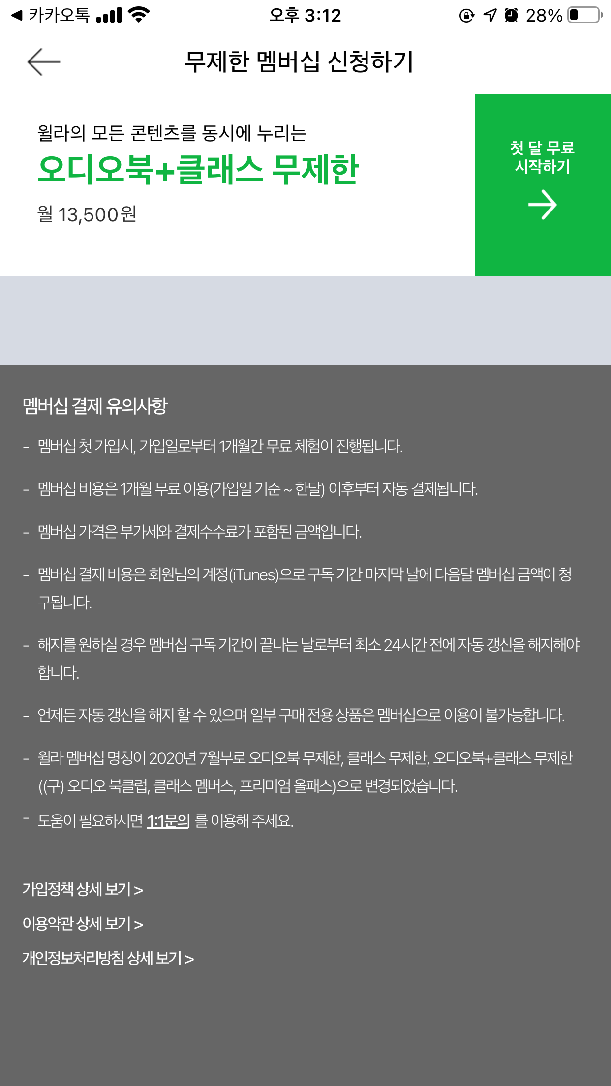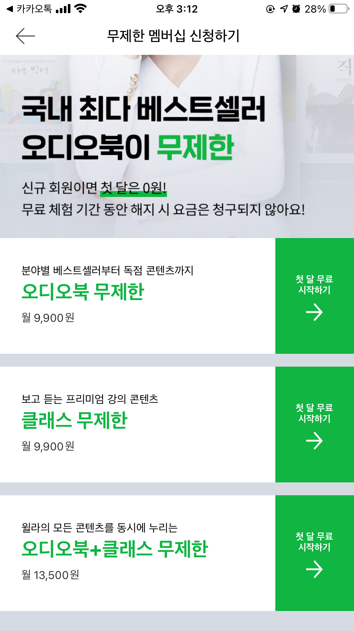 윌라 오디오북의 기본 멤버십은 세가지 형태로 오디오북 무제한 월9900원, 클래스 무제한 월 9900원, 오디오북과 클래스 두가지 모두 무제한으로 사용가능한 월 13500원의 한달이용료가 정해져 있습니다. 당연히 첫 달 무료로 시작이 가능하기에 저는 오디오북과 클래스 모두 무제한으로 이용할 수 있는 콘텐츠를 택했습니다.