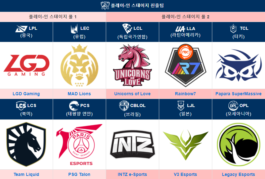 플레이-인 스테이지 진출팀은 LPL, LEC 4시드팀 + LCS 3시드팀 + PCS 2시드팀 + 나머지 6리그의 1시드팀 = 10팀 입니다.
