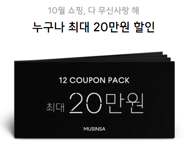 매일 오전 11시에 진행되는 이벤트이므로 늦지 않게 미리 찾아서 혜택 챙기시면 좋겠습니다. 무신사에서 꾸준히 이벤트를 진행중입니다. 무신사랑 해 이벤트 외에도 쿠폰팩 발급 이벤트를 진행중입니다. 쿠폰팩은 최대 20만원 상당의 12개의 쿠폰이 지급됩니다.