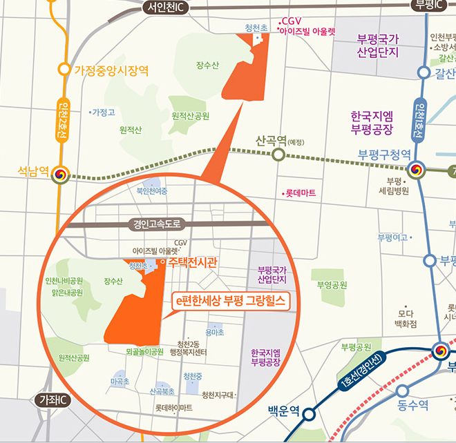 서울과 연결되는 지하철로 아직까지는 사업지가 서울에 많이 몰려 있기 때문에 지하철 연장구간으로 산곡역이 2021년에 개통 예정되어있어 관심이 갑니다. 또한 인천시와 국방부의 군부대 재배치 사업과 연계하여 원도심 활성화와 앞으로 어떠한 도시개발계획이 확장될지에 대한 기대도 큽니다.