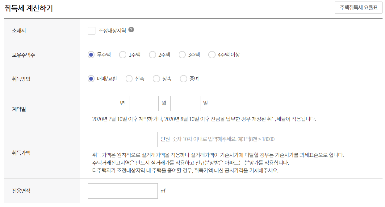 현재 계약하려고 하는 아파트의 취득가액과 전용면적까지 입력해주시면 되는데요. 여기에서 취득가액에는 실거래가액을 적용하여 주시면 됩니다. 신규분양받은 아파트의 경우에는 분양가를 입력하시고 조정지대상지역 내의 주택을 증여할 경우에는 취득가액 대신 공시가격을 기재하여야 한다고 합니다.
