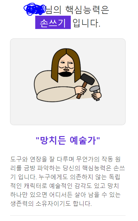 모든 질문이 끝나면 바로 답이 나오고 저의 핵심능력 테스트 결과 손쓰기가 나왔습니다. 재미로만 보기엔 상당히 디테일한 내용입니다. 예술적 감각이 있고 어디서든 살아 남을 수 있는 생존력의 소유자라네요.