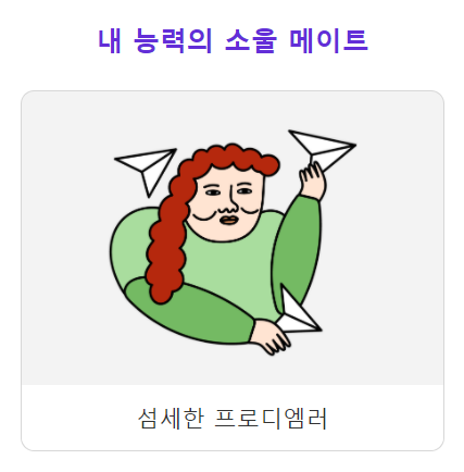 마지막으로 핵심능력 테스트 결과에는 내 능력의 소울 메이트가 나옵니다. 주변 친구들과도 한번씩 해보시고 내 능력 소울메이트가 친구중에 있는지 서로 결과를 공유해보는 것도 재밌을 것 같습니다. 핵심능력 테스트 홈페이지로 이동하시면 테스트가 가능합니다. 핵심능력 테스트 홈페이지 바로가기