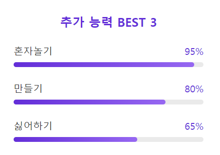 테스트 결과에는 추가 능력 세가지도 나옵니다. 혼자놀기, 만들기, 싫어하기가 나왔습니다.