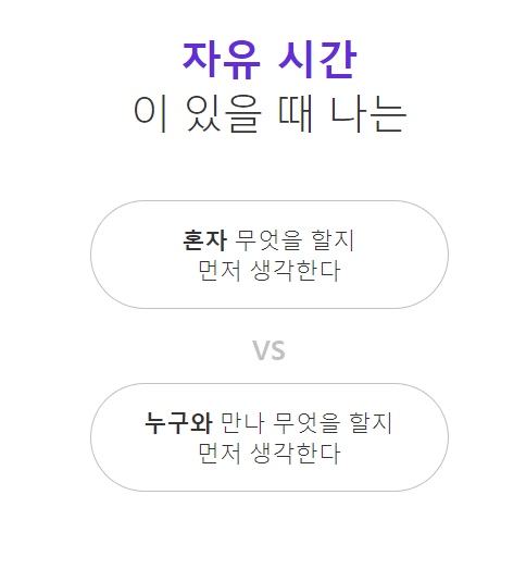 12개의 문제중 핵심능력 테스트에서 나온 문제는 자유시간이 있을 때에 혼자 무엇을 할지 먼저 생각하는지 누구와 만나 무엇을 할지 먼저 생각하는지에 대한 질문입니다. 저는 혼자 무엇을 할지 생각해본다고 답을 눌러봤습니다.