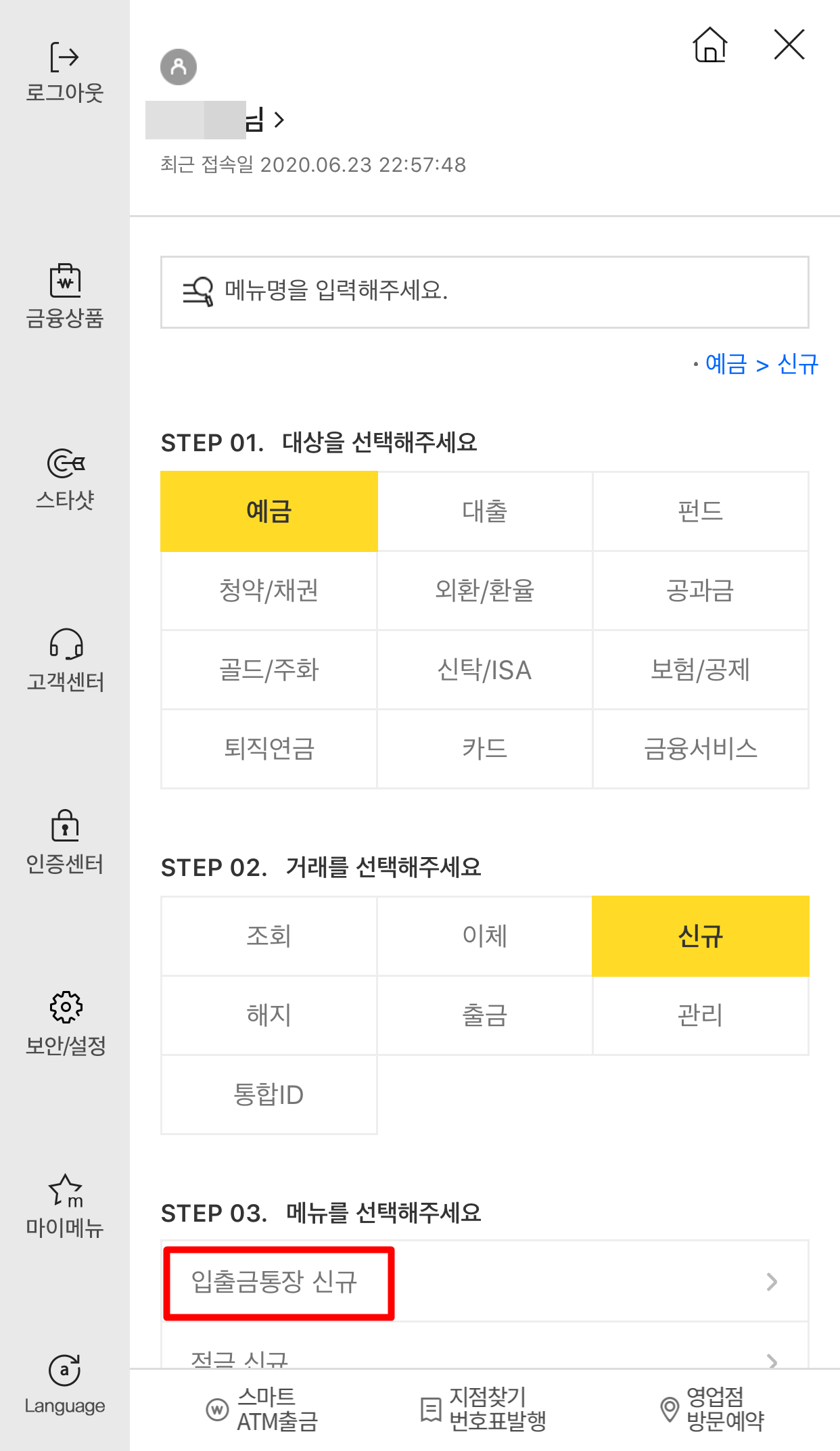 예금과 신규에 체크하시고 입출금통장 신규를 눌러주세요.