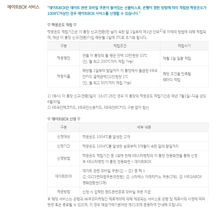 데이트박스란 데이트 관련 모바일 쿠폰이 들어있는 선물박스로 은행이 정한 방법에 따라 신청이 가능한 KB짝꿍통장만의 서비스 혜택입니다.