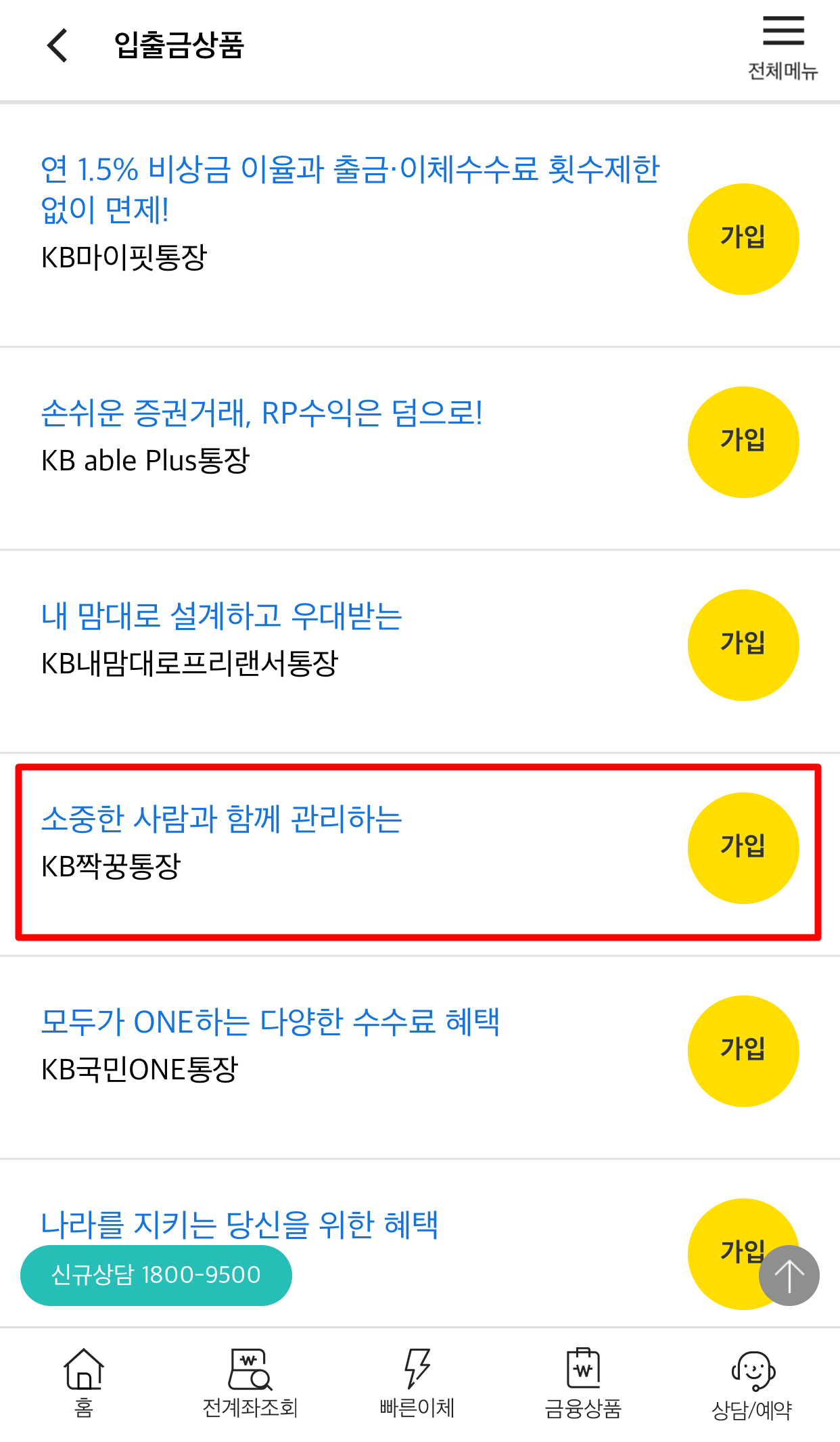 전체상품 중 KB짝꿍통장의 가입을 눌러주세요.