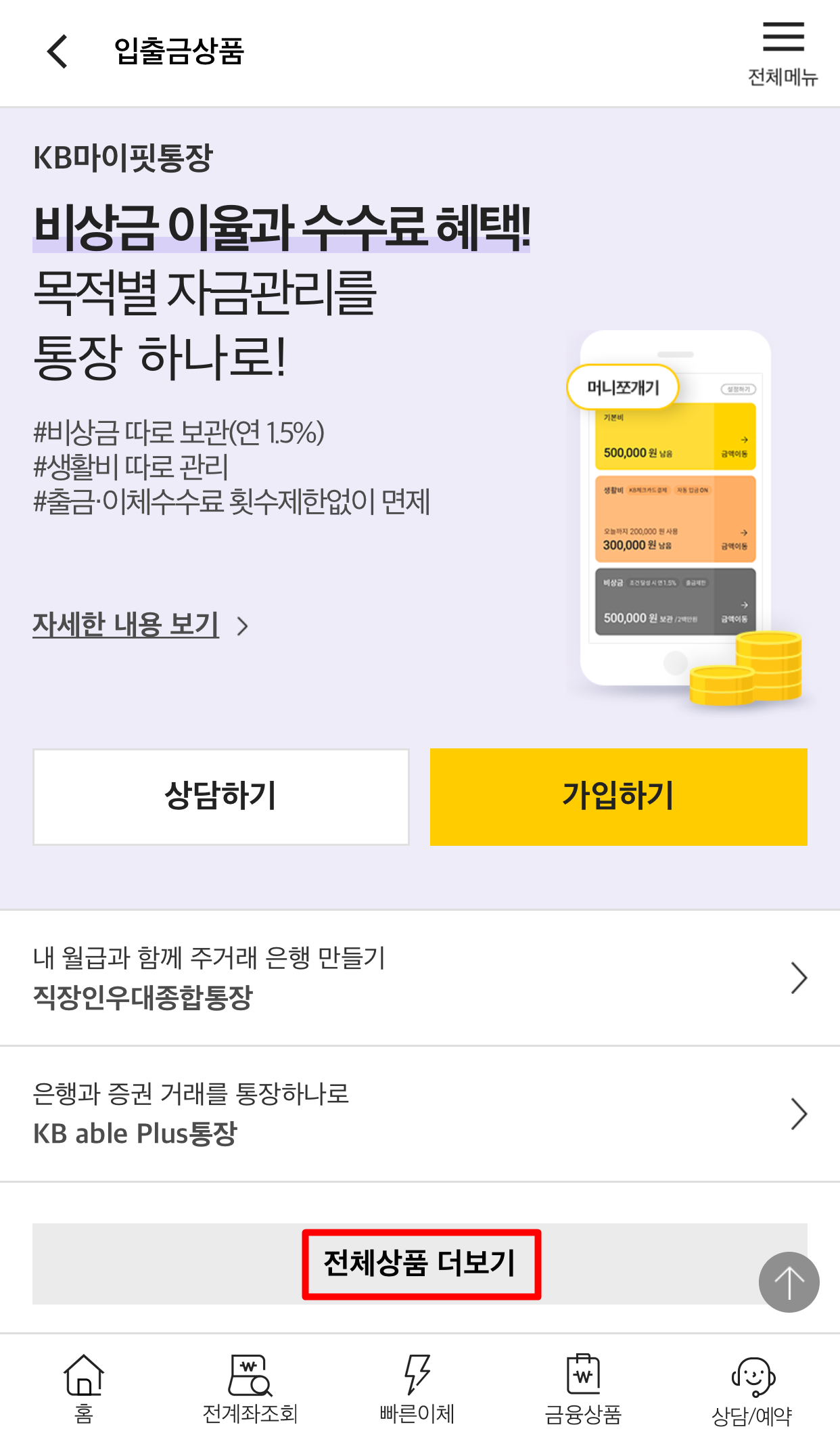 다양한 입출금 상품이 나옵니다. 전체 상품 더보기를 눌러주세요.