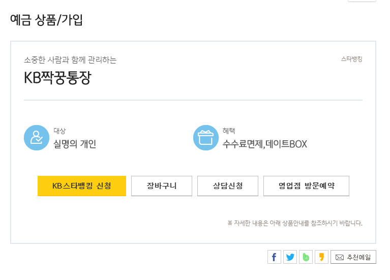 해당 상품은 실명의 개인을 대상으로 하여 가입하실 수 있습니다. 공동으로 자금관리가 필요한 경우에 제공되는 거래내역 공유 및 꾸미기가 가능하고 스마트폰에 특화된 서비스를 제공한다고 합니다.