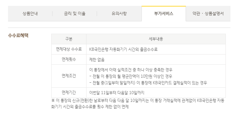 수수료 혜택은 면제 횟수 없이 KB국민은행 자동화기기 시간 외 출금 수수료가 면제됩니다.