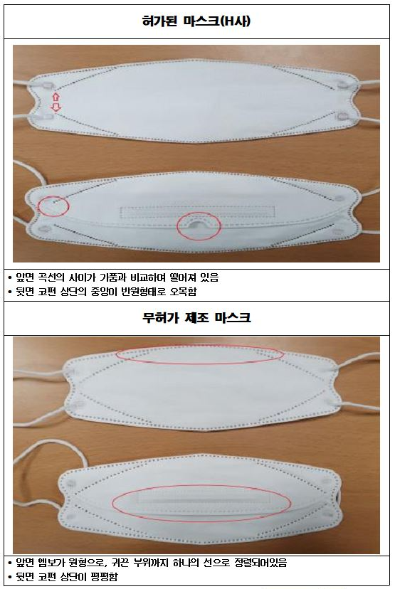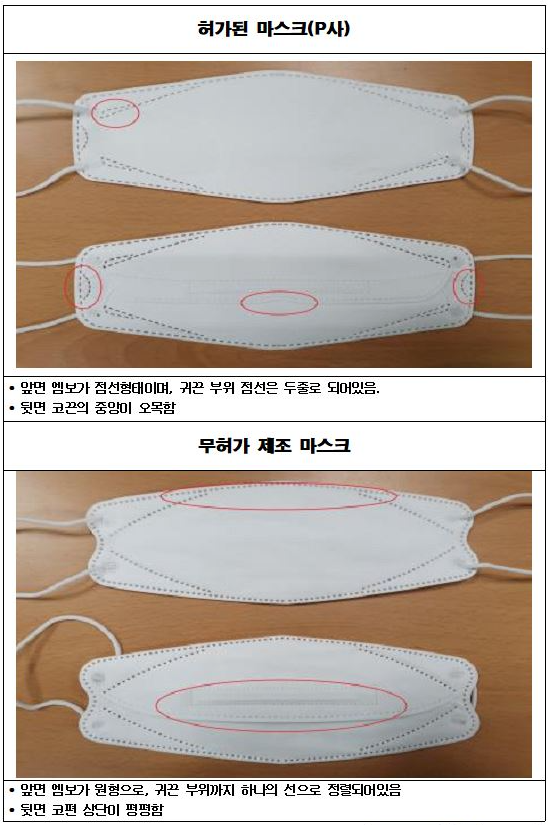 허가된 마스크는 앞면 엠보와 귀끈 부위 점선 뒷면 코끈에서 차이를 보입니다.