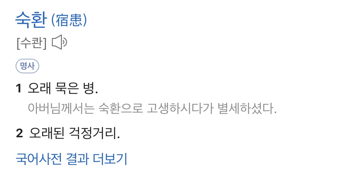숙환의 한자어를 살펴보시겠습니다. 오래 묵은 병과 오래된 걱정거리를 뜻한다고 하는데요. 최근 별세하신 유명인 분들의 부고 소식을 접할 때에도 많이 듣게된 단어입니다.