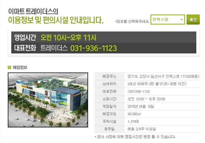 경기도 고양시 일산서구에 위치한 킨텍스점 입니다. 영어시간은 오전 10시 부터 오후 11시 까지 입니다. 매월 둘째, 넷째주 수요일이 휴무일입니다. 해당 지점은 다른 곳과는 달리 매주 수요일이 휴무일 입니다. 참고하시기 바랍니다.