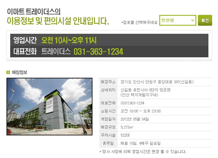 경기도 안산시 단원구에 위치한 안산점 입니다. 신길동 휴먼시아 9단지 맞은편에 있다고 합니다. 이마트 트레이더스 안산점의 영업시간은 오전 10시 부터 11시까지 입니다. 다른 이마트 트레이더스 지점과는 다른 휴무일로 변동사항이 있습니다. 이마트 트레이더스 안산점은 매월 10일과 넷째주 일요일이 휴무입니다. 안산점을 이용하시는 분들은 이 점 반드시 미리 알고 계시면 좋을 것 같습니다.