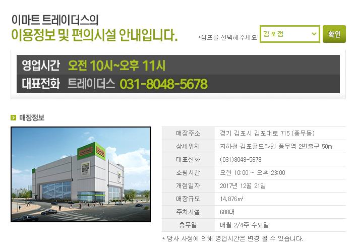 경기도 김포시에 위치한 김포점입니다. 지하철 김포골드라인 풍무역에 하차하시어 2번출구로 나오시면 50미터 이내에 이마트 트레이더스 김포점을 만나보실 수 있습니다. 주차시설은 700대 미만으로 가장 적습니다. 휴무일은 매월 둘째, 넷째주 수요일 입니다.