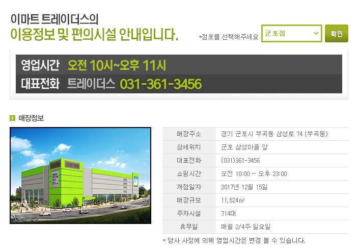 경기도 군포시 부곡동에 위치한 군포점입니다. 매월 둘째, 넷째주 일요일이 휴무일 입니다. 군포 삼성마을 앞에 위치하여 찾아가기 쉽습니다. 주차시설은 700대정도 가능합니다.