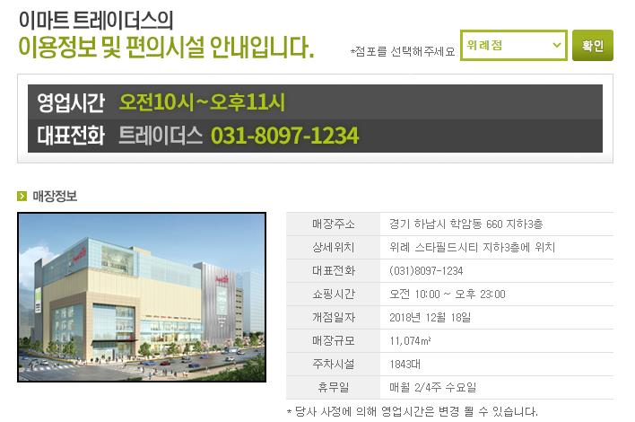 경기도 하남시에 위치한 위례점 입니다. 위례 스타필드시티 지하 3층에 있어 찾아가시기 편리합니다. 스타필드 내에 위치한 이마트 트레이더스는 대부분 매월 둘째, 넷째주 수요일이 정기 휴무일입니다.