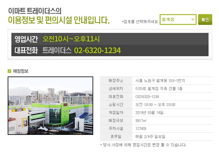 서울시 노원구에 위치한 월계점 입니다. 이마트 월계점 바로 옆의 우측 건물 1층 입니다. 매월 둘째, 넷째주 일요일이 휴무일입니다. 7월 이마트 트레이더스 휴무일은 7월 12일과 7월 26일이 되겠습니다.