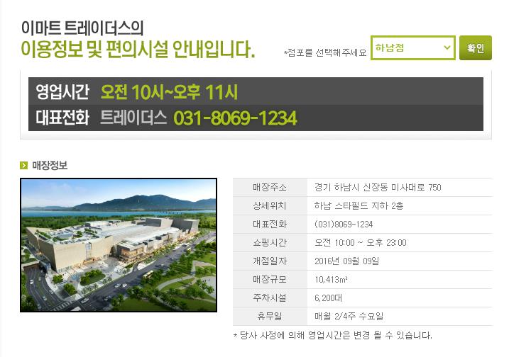 경기도 하남시에 위치한 하남점 입니다. 하남 스타필드 지하 2층에 위치한 곳 입니다. 스타필드 내에 위치하였기 때문에 트레이더스 이용 뿐만 아니라 다른 점포드를 이용하기에도 편리합니다. 이마트 트레이더스 하남점 또한 킨텍스점과 마찬가지로 매월 둘째, 넷째주 수요일이 휴무일 입니다.