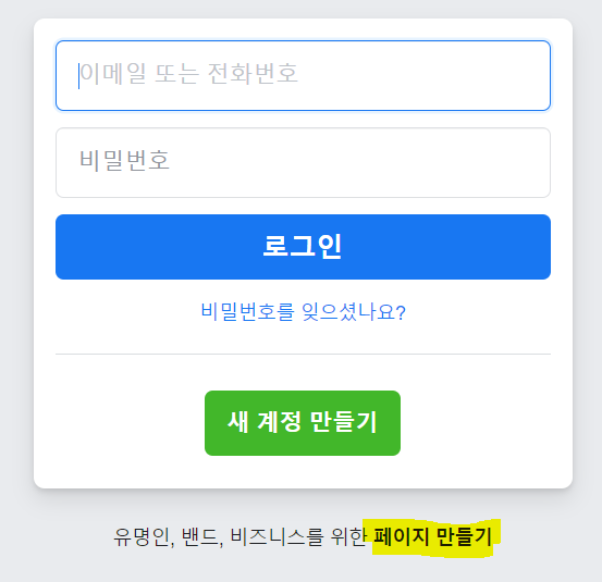 우선 페이지를 여러개 생성하고 나면 비지니스 또는 브랜드 혹은 커뮤니티 또는 공인 선택지 조차 나타나질 않습니다. 먼저 이 화면을 다시 활성화 하기 위한 방법입니다. 우선 페이스북 로그인 되어있는 홈페이지를 로그아웃하셔서 최초의 로그인 화면으로 이동하시기 바랍니다.