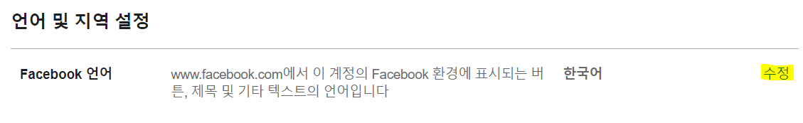 여기에서 언어를 변경할 수 있습니다. 우리는 한국어를 보통 사용중이지만 수정을 눌러 영어로 변경해주셔야 합니다.
