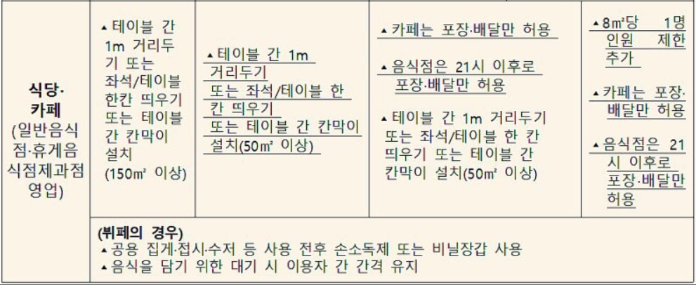가장 핵심으로 보이는 제주도 2단계 격상시 일반 음식점 및 휴게음식점 제과점 영업에 대해서는 카페는 포장과 배달만 허용되며 음식점은 21시 이후로 포장과 배달만 허용됩니다. 테이블 간 1m 거리두기 또는 좌석과 테이블 한 칸 띄우기 혹은 테이블 간 칸막이 설치(50티터 제곱 이상)가 요구 됩니다. 뷔폐의 경우에는 공용 집게, 접시, 수저 등 사용 전후에 손소독제 또는 비닐장갑을 사용하게 하고 음식을 담기 위한 대기 시에는 이용자간 간격을 유지해야 합니다.