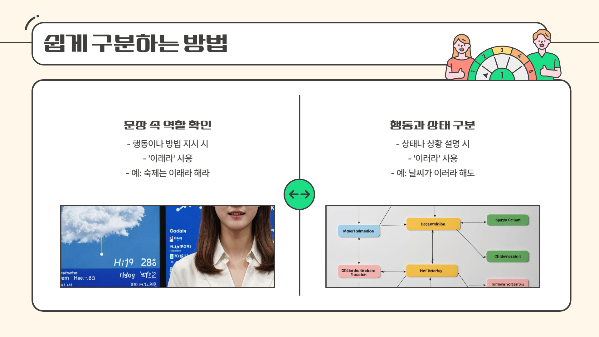 또 다른 예시를 들어볼까요? 학교에서 선생님이 "숙제는 이래라 해라"라고 하실 때는 '이래라'가 맞습니다. 구체적인 행동을 지시하는 상황이니까요. 하지만 "시험 성적이 이러라 해도 포기하지 마"라고 할 때는 '이러라'를 써야 합니다.