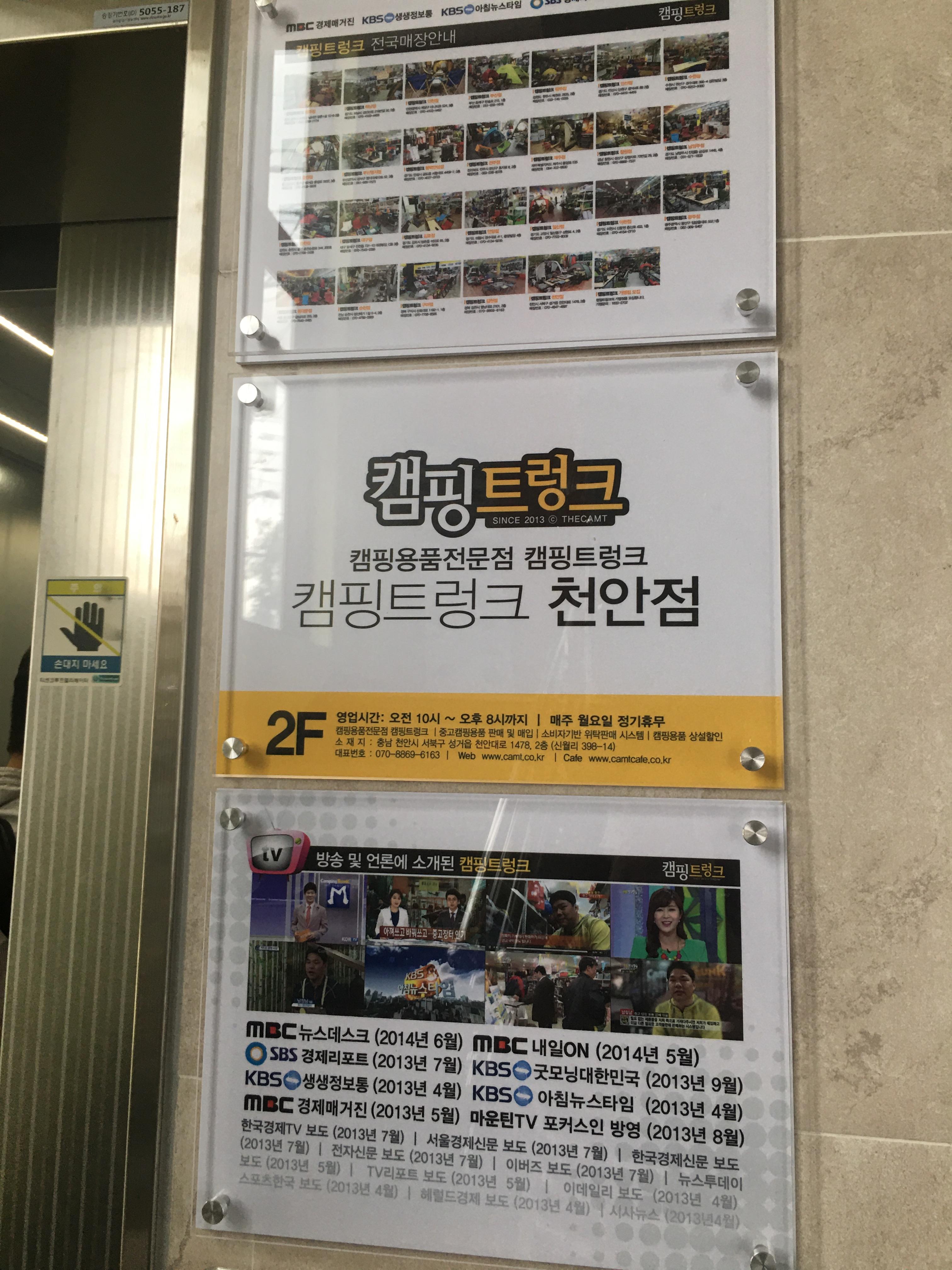 건물 안쪽으로 들어가시면 엘레베이터가 있습니다. 바로 앞에 캠핑트렁크 천안점의 로고가 크게 붙여져 있습니다. 방송이나 언론에도 많이 소개되었던 곳인가 봅니다. 해당 언론사와 방송에 출연했던 기록들도 나열되어 있어요.