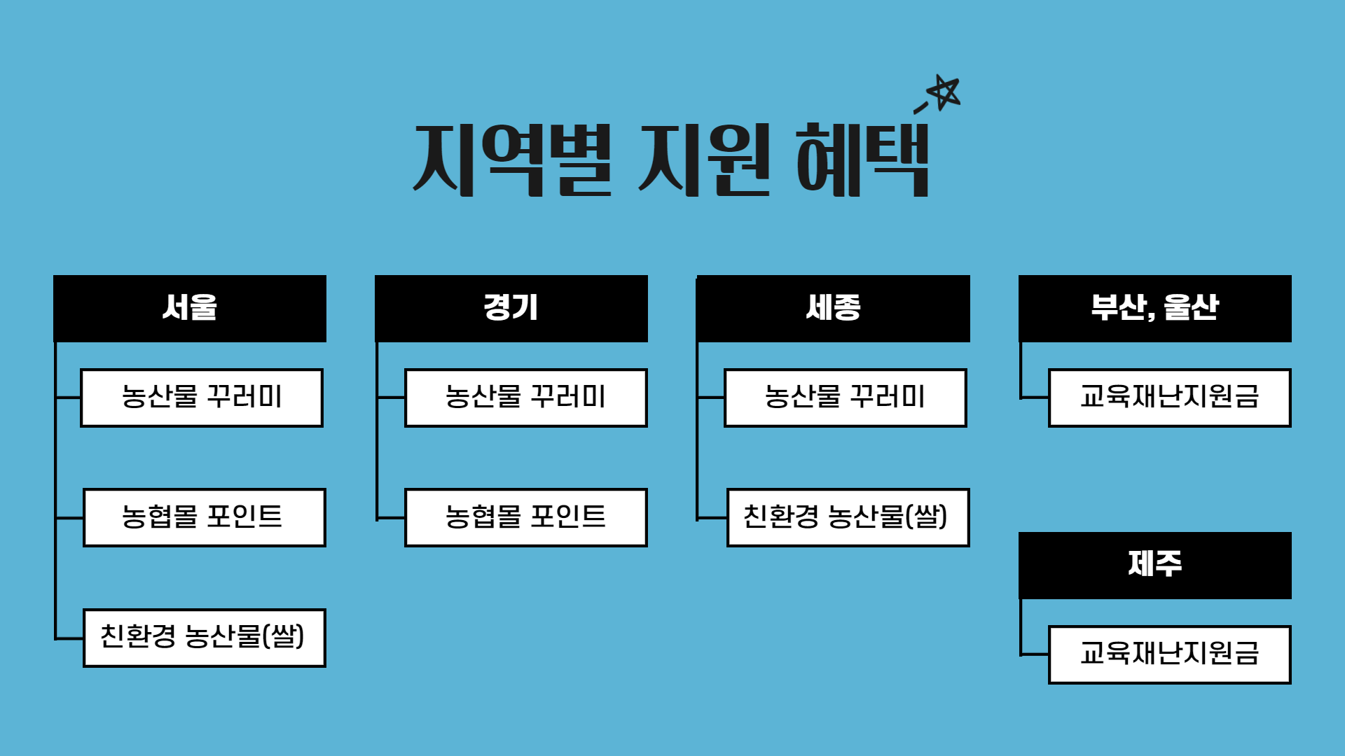 지역별로 교육재난지원금 혜택과 초중고 농산물 꾸러미 지원 사업 혜택이 상이하니 정확하게 파악하시고 생활에 큰 도움되시기 바라겠습니다.