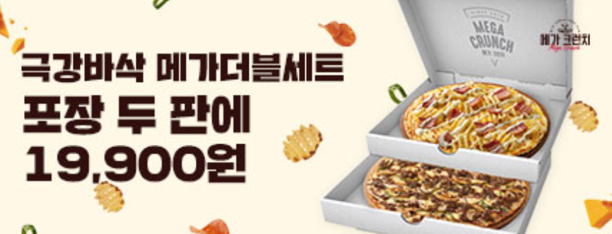 여섯가지 메가크런치 메뉴 교차 선택이 가능한 피자헛 방문포장 할인 이벤트입니다. 여기에서 교차가능한 피자의 종류를 포장으로 주문하시면 방문포장할인을 받아 19,900원에 할인적용된 금액으로 주문하실 수 있습니다. 선택의 폭이 넓어 가성비 좋은 피자헛 이벤트라고도 생각합니다. 저도 자주 이용하는 이벤트로 적당한 사이즈의 적절한 가격이 안성맞춤입니다.