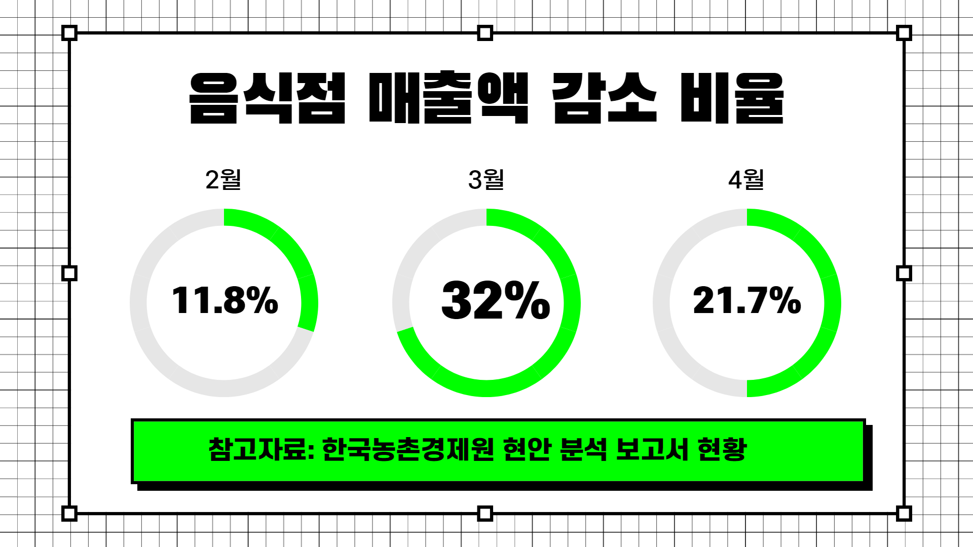 한국 농촌 경제원의 분석 보고서에 따르면 코로나 19로 4월 음식점 매출액이 전년대비 21.9% 줄었다고 합니다.