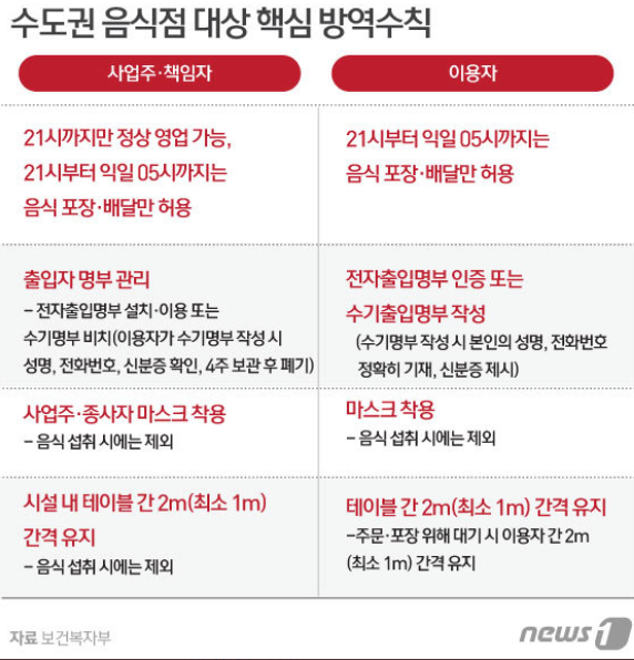 수도권 음식점 사업주와 책임자 그리고 이용자에게 해당되는 내용은 다음과 같습니다.