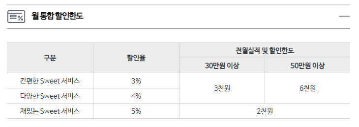 월 통합 할인한도입니다. 전월 실적이 30만 원 이상일 경우는 월 3천 원이고 50만 원 이상일 경우에는 월 6천 원입니다.
