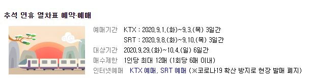 2020년 추석 기차표 예매 일정이 나왔습니다. 해당 정보를 통해서 알 수 있는 점은 코로나19의 확산을 막기 위한 특별조치가 취해졌고 기차표 예매시 현장 발매는 완전히 폐지된다고 합니다. 2020년 추석 날짜와 기차표 예매 일정까지 정확하게 알아보도록 하겠습니다.