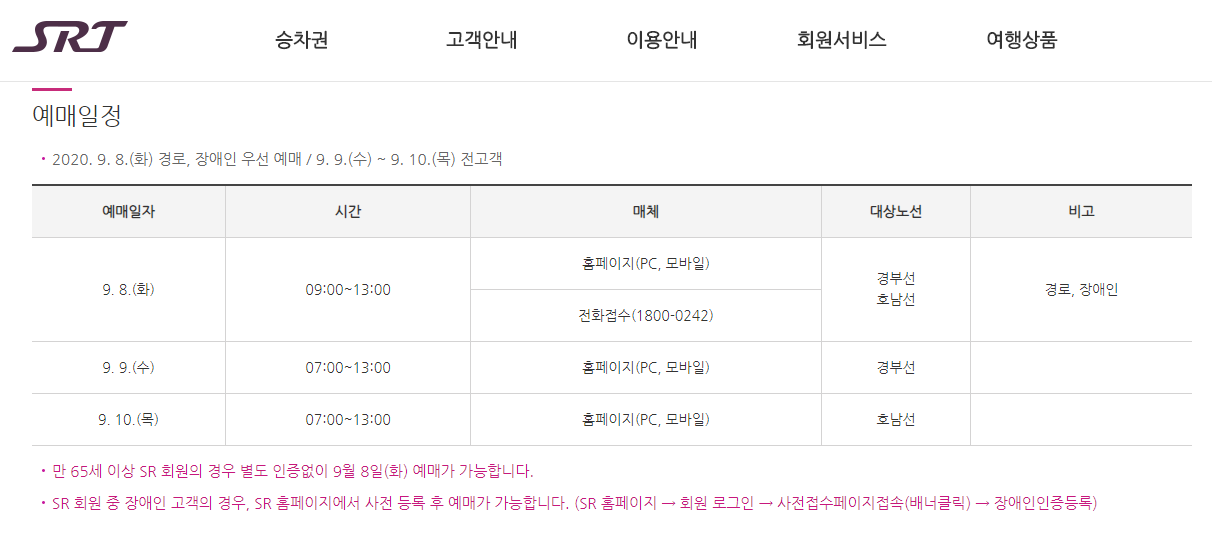 SRT에서도 9월 8일 에는 경로, 장애인 우선예매를 실시하여 전화접수를 받습니다. 해당 예매 일정을 확인하시고 온라인 예매시 차질이 없도록 하셔야할 것 같습니다. 이번 코로나19의 확산을 막기 위한 우려의 목소리가 높습니다. 최근 수도권에서 지속적으로 집단감염사례가 나오고 있어 지방에 계신 부모님을 뵙거나 노인분들과의 접촉을 최소화해야 한다는 이야기가 많은데요. 정부에서도 추석 이동제한에 대한 조심스러운 의견도 나오는 듯 보입니다만 아직 이 부분에 대해서는 정해진 바가 없다고 합니다. 아직은 개인의 판단으로 결정하여야할 문제일 것 같습니다.