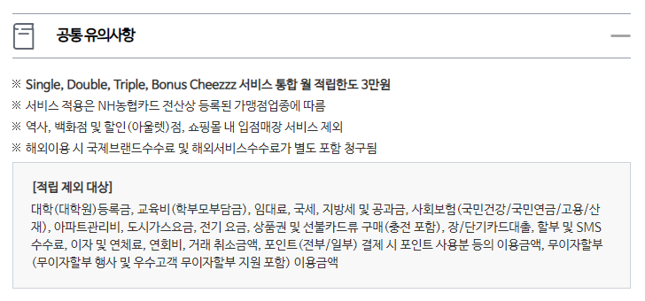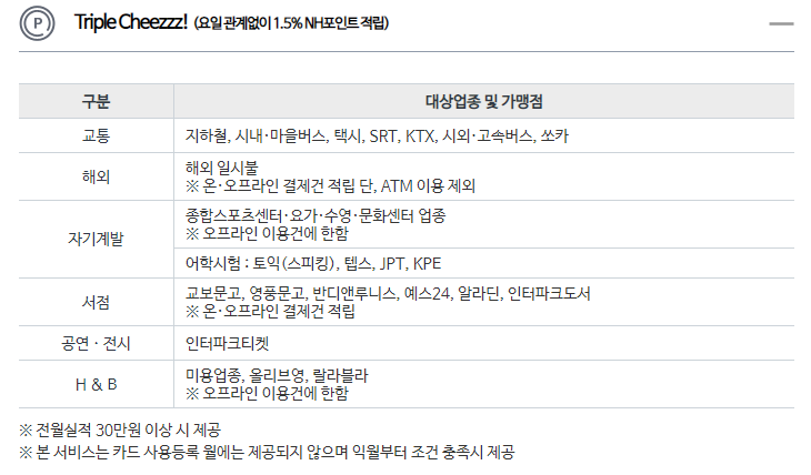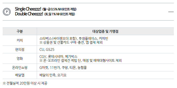 사용금액 실적별로 추가적인 혜택이 제공되는데, 전월 실적 20만원 이상 시에 제공하는 싱글치즈혜택과 더블치즈혜택으로 나뉩니다.