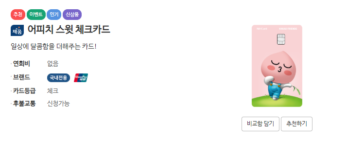 농협 어피치 체크카드 또한 카카오프렌즈 제휴로 카드 디자인에 어피치가 그려져 있습니다.