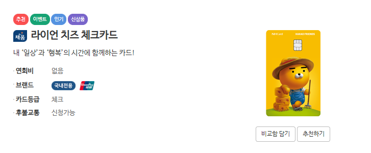 농협 체크카드 추천하면 바로 떠오르는 체크카드가 바로 라이언 치즈 체크카드입니다.