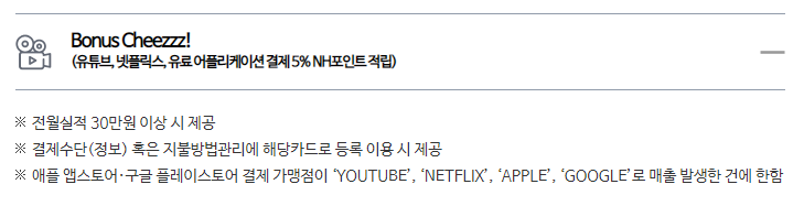 라이언 치즈 체크카드와 같은 혜택이라고 볼 수 있는 유튜브, 넷플릭스, 애플, 구글 플레이로 발생한 매출의 5%를 할인해주는 서비스입니다. 다른 점은 농협 어피치 체크카드에서는 직접 할인으로 혜택을 받으실 수 있고 라이언 치즈 체크카드에서는 농협 포인트 적립 혜택을 받으실 수 있습니다.