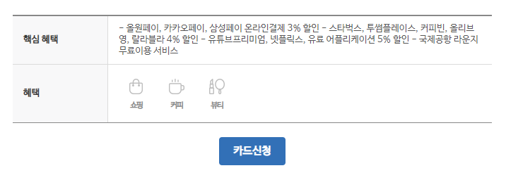 라이언치즈체크카드와 달리 요일별 적립 혜택이 아닌 온라인 페이 결제 서비스를 중심으로 할인이 이루어지고, 온라인 쇼핑과 커피 가맹점 및 뷰티 업종에서 할인이 가능합니다.