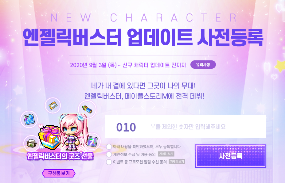해당 홈페이지에서 사전등록시 사전등록한 모든 유저들에게는 엔젤릭버스터 굿즈 선물 구성품이 지급됩니다.