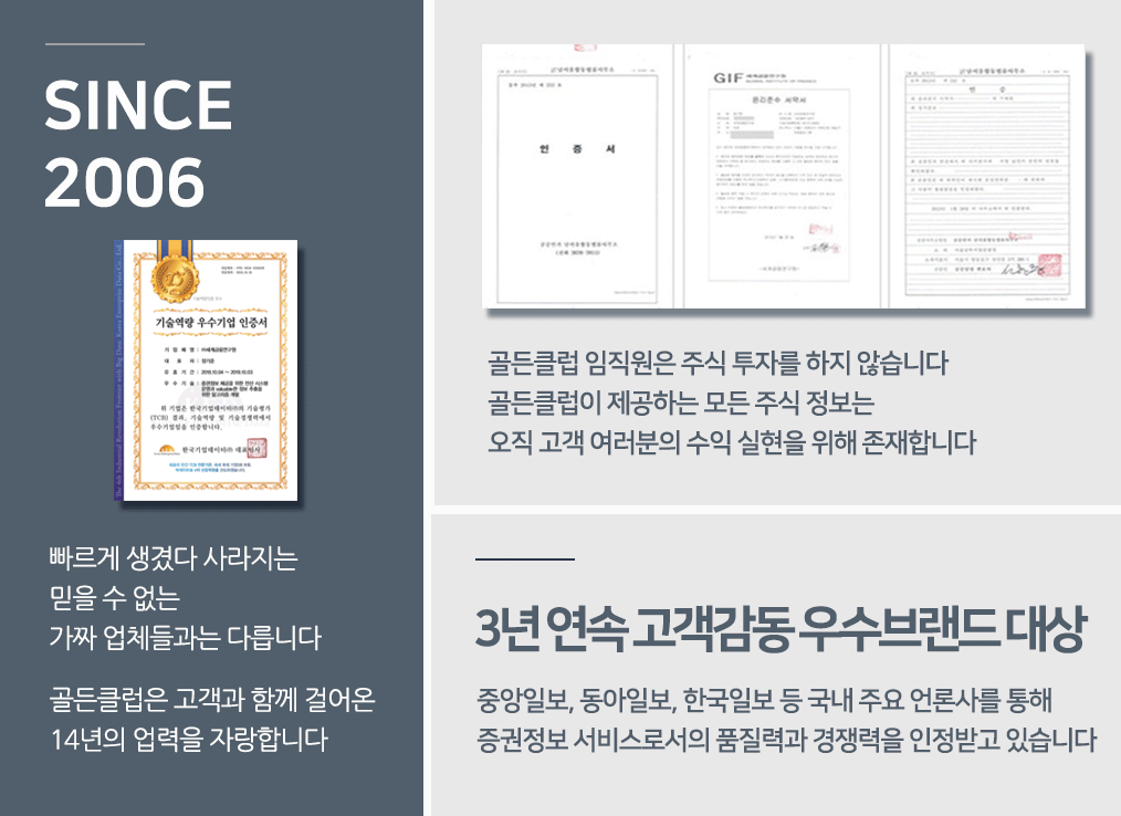골든클럽에서 유망주을 알아볼 수 있는 분석자료를 휴대폰번호로 간단하게 신청하셔서 받아보실 수 있습니다. 무료로 제공되기 때문에 부담없이 신청하셔도 좋겠습니다. 골든클럽 전문 인력에는 투자자산운용사, 금융투자분석사, 펀드투자상담사, 증권투자상담사, 금융자산관리사, 메이저증권사, 파생상품투자상담사 등이 있습니다.