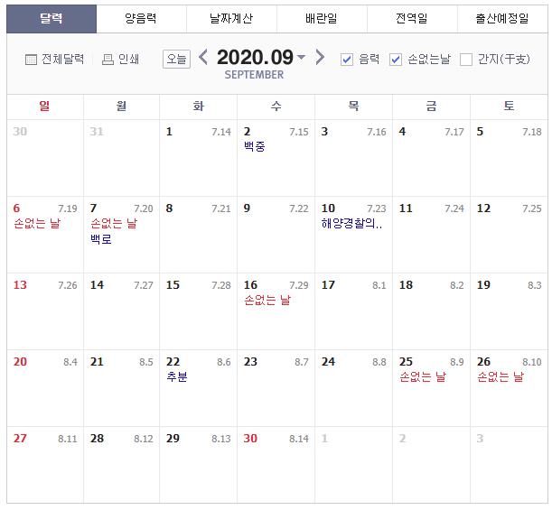 2020년 음력 달력 기준으로 9월 손 없는 날은 9월 6일, 9월 7일, 9월 16일, 9월 25일, 9월 26일 입니다.