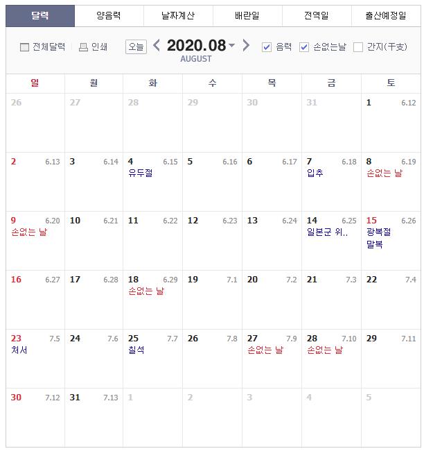 2020년 음력 달력 기준으로 8월 손 없는 날은 8월 8일, 8월 9일, 8월 18일, 8월 27일, 8월 28일 입니다.