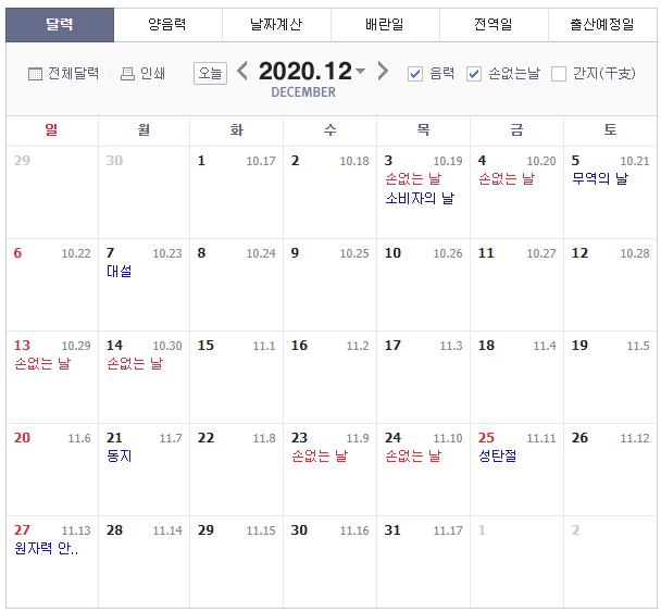 2020년 음력 기준으로 12월 손 없는 날은 12월 3일, 12월 4일, 12월 13일, 12월 14일, 12월 23일, 12월 23일 입니다.