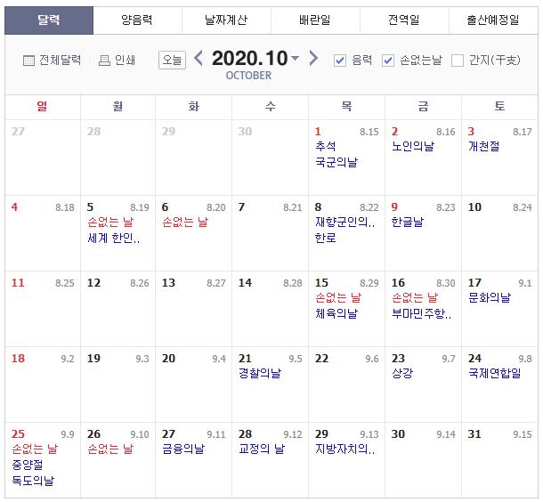 2020년 음력 달력 기준으로 10월 손 없는 날은 10월 5일, 10월 6일, 10월 15일, 10월 16일, 10월 25일, 10월 26일 입니다.