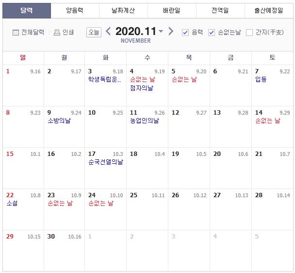 2020년 음력 달력 기준으로 11월 손 없는 날은 11월 4일, 11월 5일, 11월 14일, 11월 23일, 11월 24일 입니다.