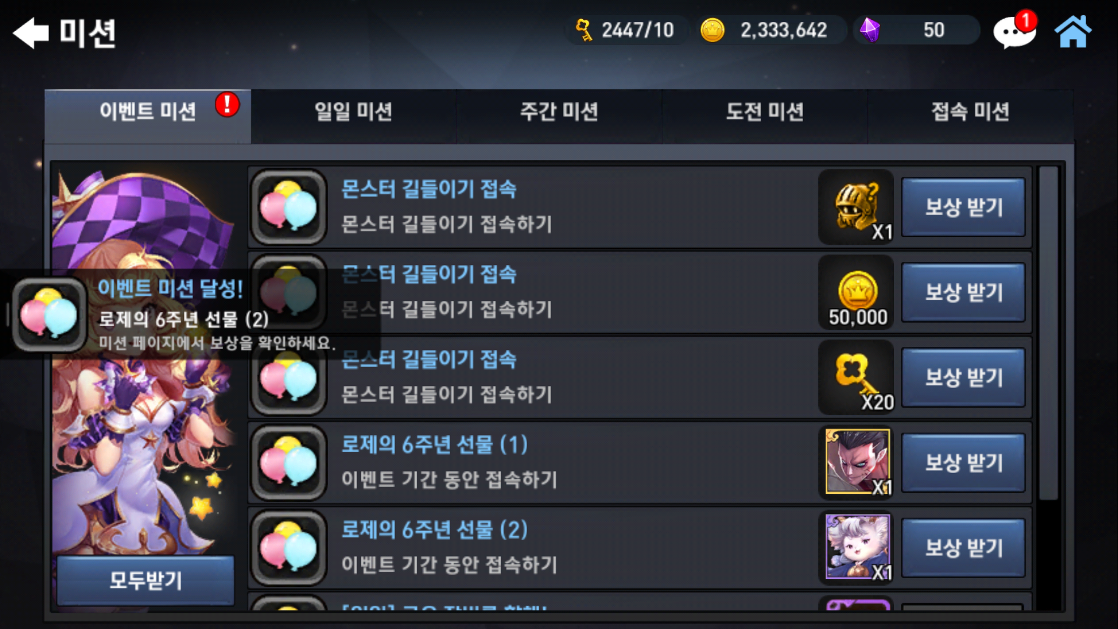 사전예약 등록 후 오랜만에 해당 계정에서 다시 로그인하여 플레이 해보았습니다. 복귀유저의 보상이 상당히 많습니다. 이 기회에 몬스터길들이기 다시 시작해보니 감회가 새롭고 재밌습니다. 몬스터길들이기 등급표 찾아가며 게임했던 시간들이 생각납니다.